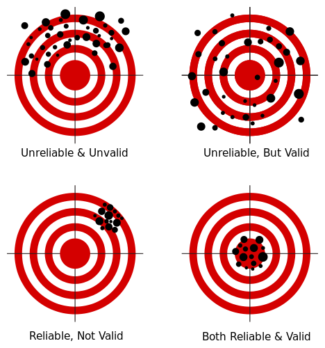 I won’t try to summarize a methodology textbook here by trying to explain the concept of validity. Luckily, Nevit Dilmen made an excellent image illustrating what validity is: