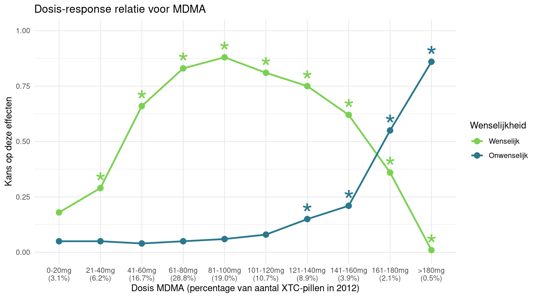 Net als de kans op incidenten is de kans op overlijden per gebruiksgelegenheid onder andere een functie van de dosis MDMA die wordt gebruikt. En de kans op overlijden per gebruiker per jaar is dan bovendien weer een functie van hoe vaak diegene per jaar gebruikt.