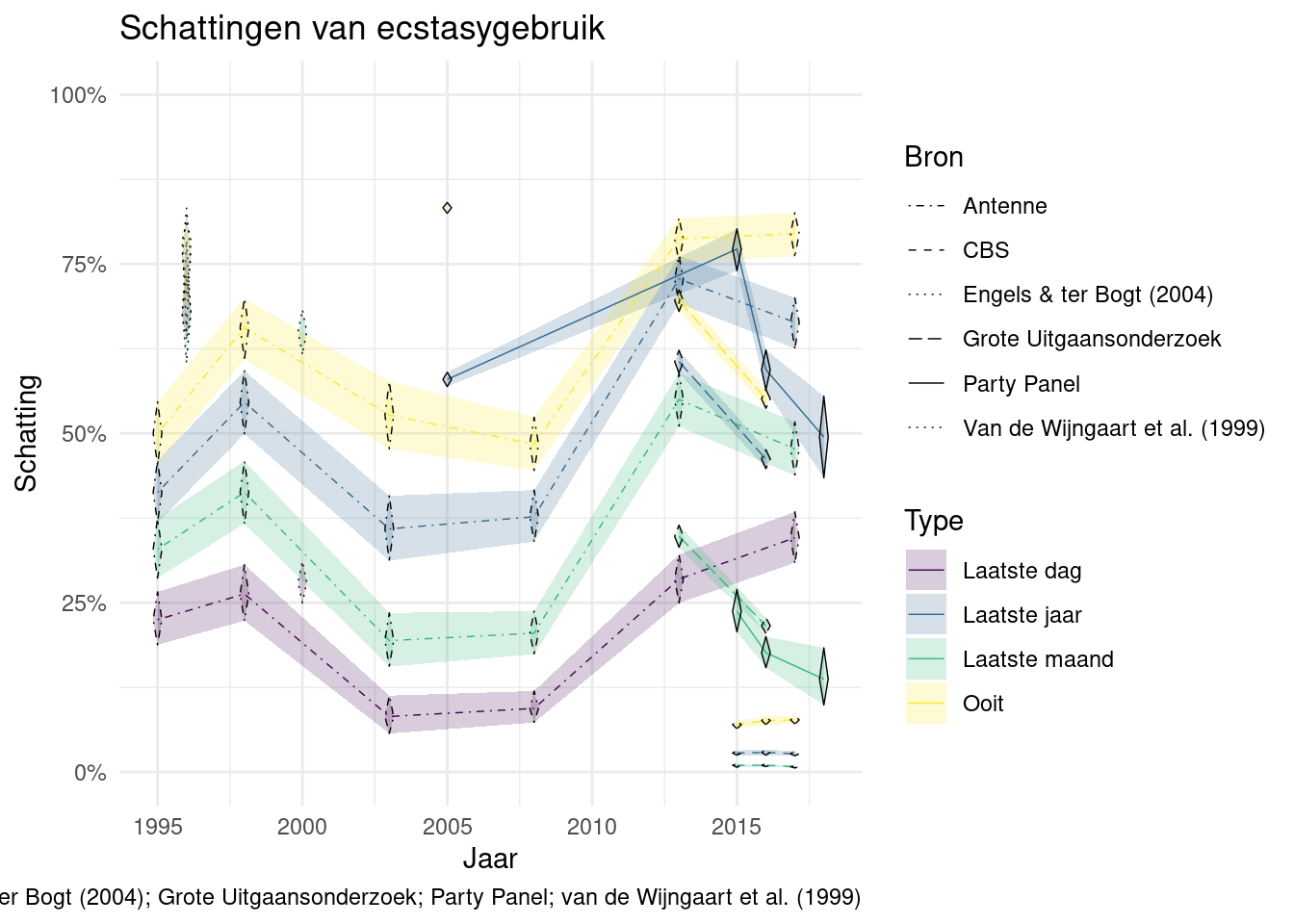 Hier is goed zichtbaar hoe uiteenlopend de schattingen uit de verschillende studies zijn. Er komt duidelijk geen eenduidig beeld naar voren: twintig jaar vonden Van de Wijngaart et al. (1999) vergelijkbare gebruikscijfers als in de Party Panel ronde uit 2015, en aanzienlijk hoger dan in de latere Party Panel rondes. Het Grote Uitgaansonderzoek zit er tussenin, en de Antenne daalde een beetje en steeg toen weer een beetje.