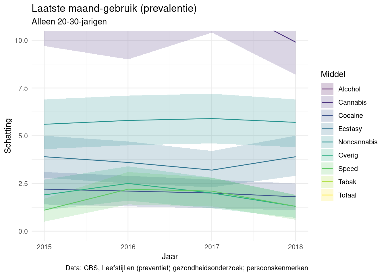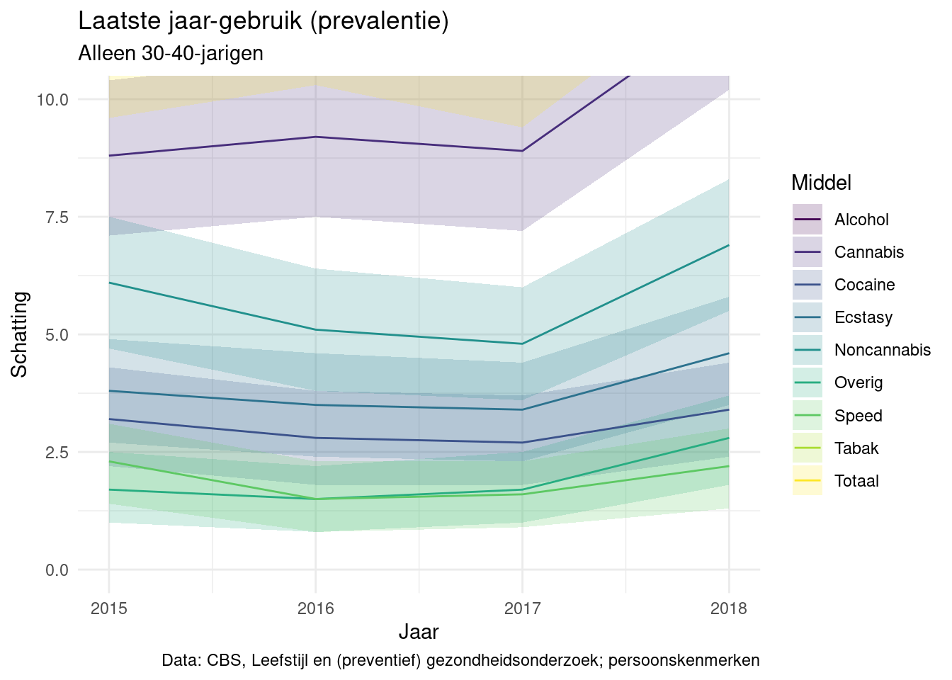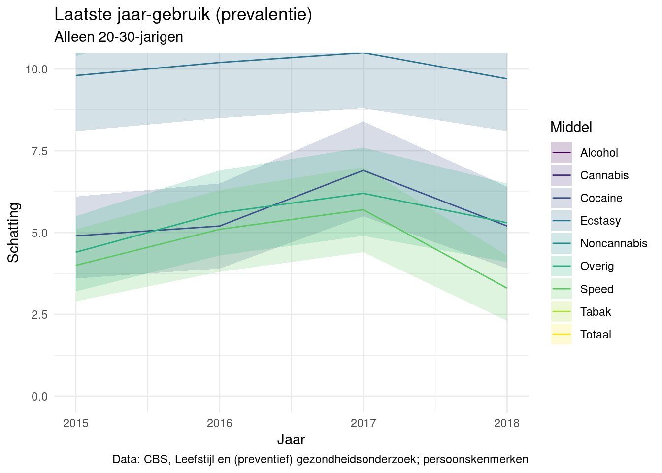 Hier is duidelijk te zien dat er geen reden is om aan te nemen dat middelengebruik de afgelopen vier jaar is veranderd. Er zijn fluctuaties in de puntschattingen (de lijnen), maar de banden eromheen, die de 95% betrouwbaarheidsintervallen representeren, laten duidelijk zien dat die schattingen zo onzeker zijn dat ze consistent zijn met stabiel gebruik.