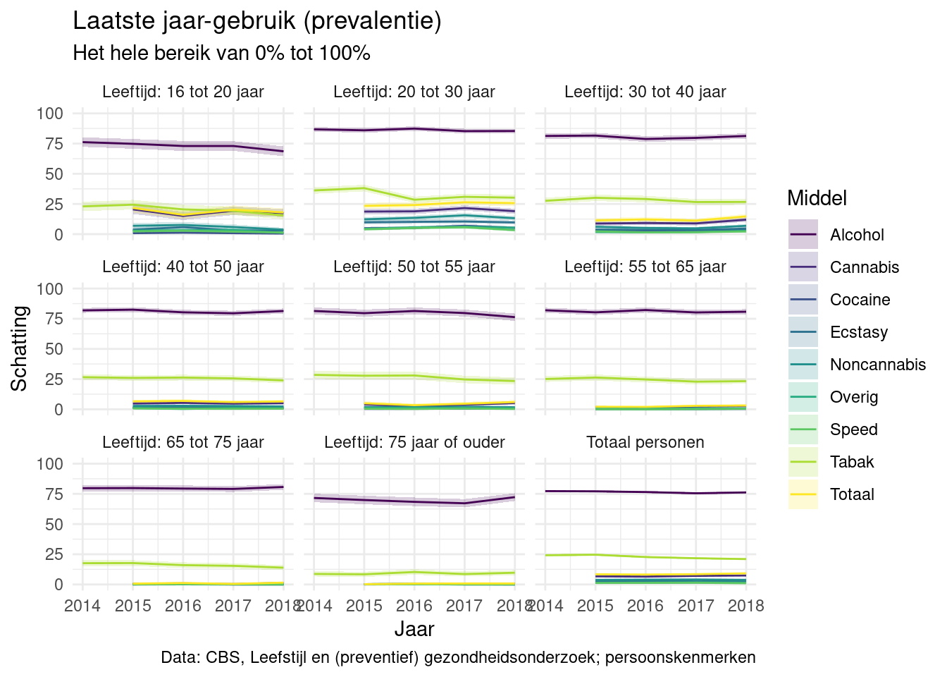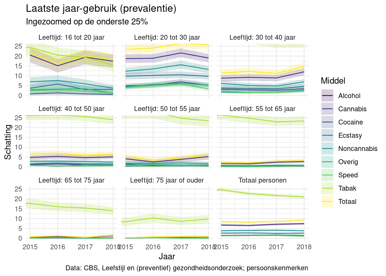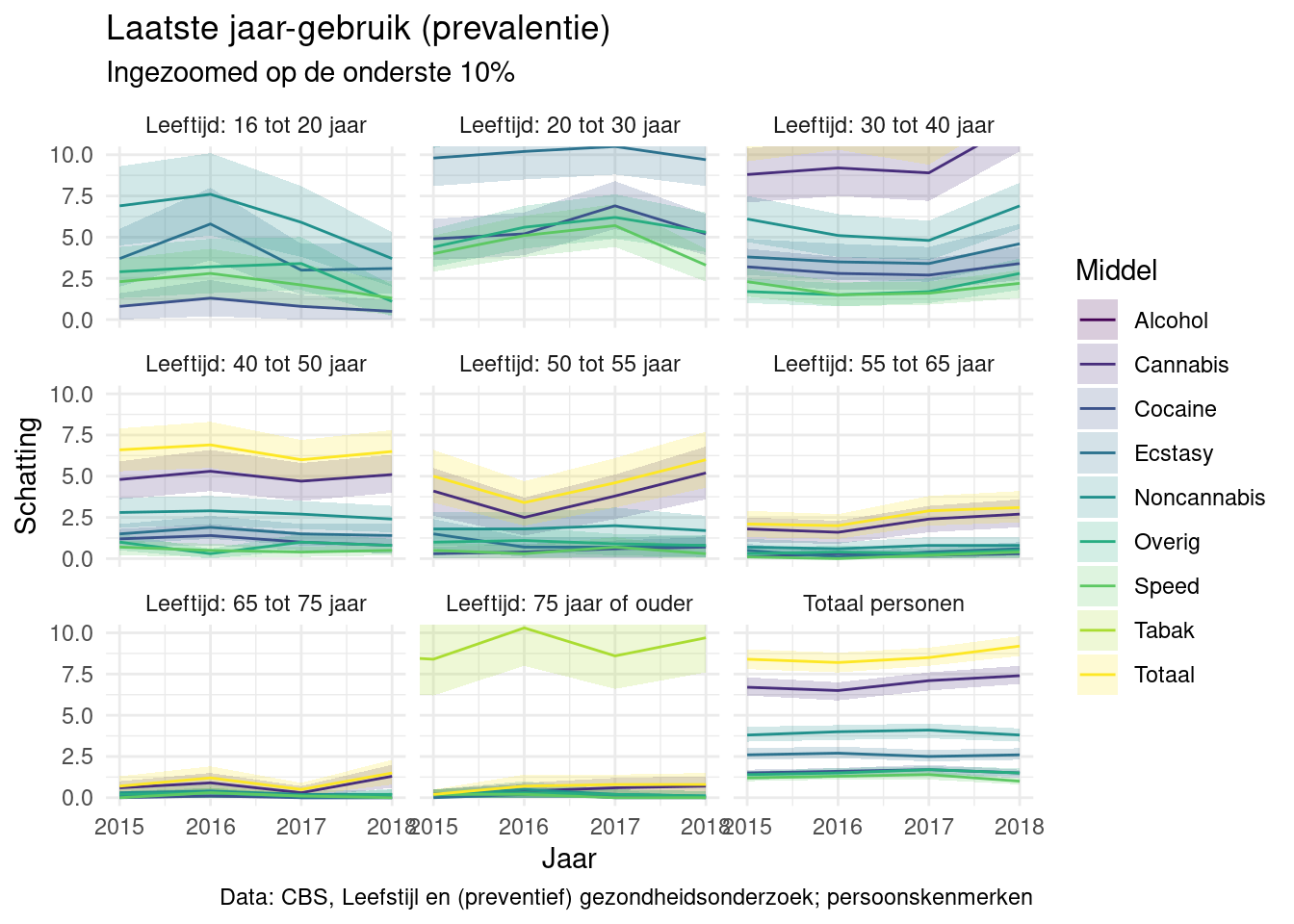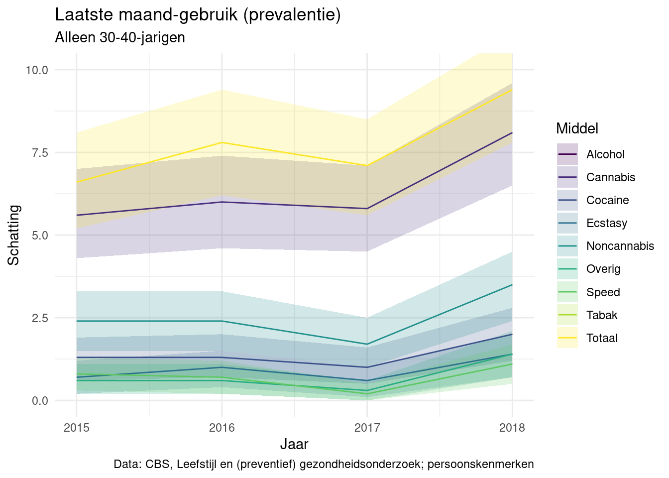 Hier is duidelijk te zien dat er geen reden is om aan te nemen dat middelengebruik de afgelopen vier jaar is veranderd. Er zijn fluctuaties in de puntschattingen (de lijnen), maar de banden eromheen, die de 95% betrouwbaarheidsintervallen representeren, laten duidelijk zien dat die schattingen zo onzeker zijn dat ze consistent zijn met stabiel gebruik.